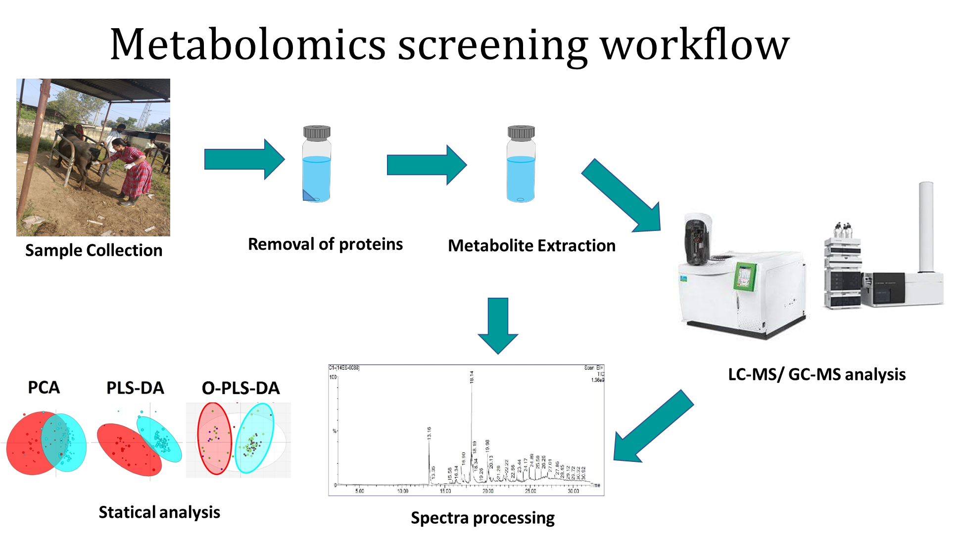 Indian subcontinent is a rain fed agriculture based developing country having a large population size of more than 120 billion people. To sustain a huge population food becomes an important factor. India is continuously working on increasing the yield of food from both the plant and animal based food industry. To increase the production of milk and milk based products it becomes very important to inseminate the animal during the ovulation period. The present method of the determination is mainly based on experience of the veterinarian and subclinical symptoms. However, these methods are not full proof and there is a chance of failure of artificial insemination. There is a need to develop species specific methods to determine the estrus. Buffalo is a silent heat animal and it doesn’t show estrus specific signals which are predominant in cattle. Hence there is a need to develop methods to detect estrus phase in buffalo in the field. The project aims to develop a field based application method/device to detect the estrus in buffalo. We are using GC-MS and LC-MS based untargeted metabolomics along for the discrimination of the estrus phase. The data recorded in these mass spectrometers are analyzed using various R packages and open source software such as Metaboanalyst.