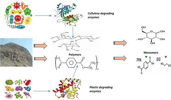 Cellulose is the most abundant, homogeneous and recalcitrant polysaccharide in lignocellulosic portion of MSW. Cellulose and hemicellulose are main degradable components of MSW but the presence of surrounding lignin polymer limits its biodegradability. Plastic is chemically, physically and biologically inert, and also it has long durability as it cannot degrade quickly due to complex blends of polymerized long chain backbones and addition of additives in order to increase the strength of plastic. Physiochemical is preferred option for bioremediation but large initial investment, higher operation cost, little or no energy production limits its application. Microbial technologies are gaining more importance recently due to its widely application in environmental remediation. Some genera such as Cellulomonas, Pseudomonas, Bacillus, and Micrococcus are important cellulose degraders while bacteria like Ideonella sakaiensis are reported for plastic degradation, but the requirement of its specific environment and media for cultivation limits its widespread applications for MSWM on field scale. Microbes are very difficult to degrade synthetic chemical bonds within the plastic. There is no safe way for disposal of plastic also it remains persistent in food chain. Lack of effective recycling policy of plastic is another challenge. Changing waste composition and some techno environmental issues are major challenges in MSW management.